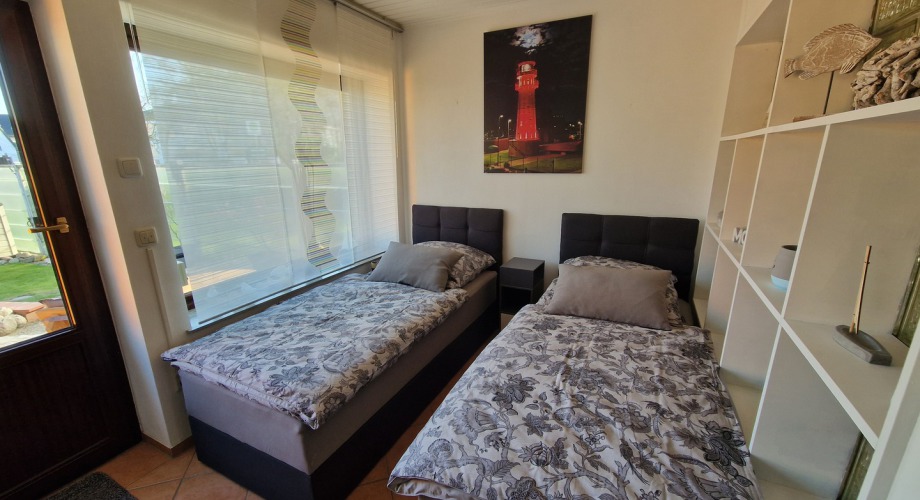 1 Schlafzimmer mit 2 Einzelbetten (Boxspring 80cm x 200cm) und Großem Kleiderschrank mit Ganzkörperspiegel.
